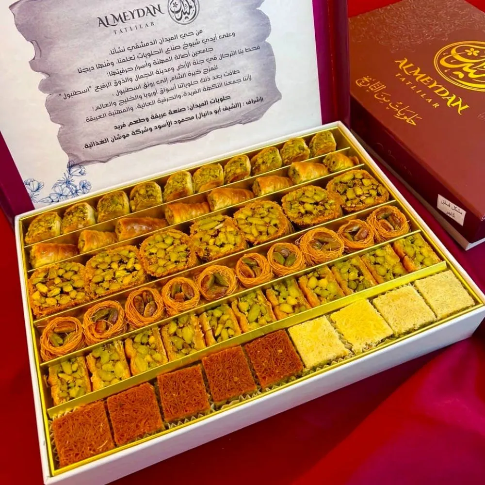 Fıstıklı karışık baklava, hafif şerbet ve tam hayvansal yağ , kraliyet kutusunda paketlenmiştir. Ağırlık 750 g